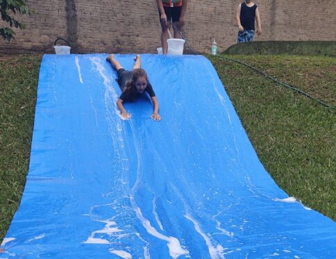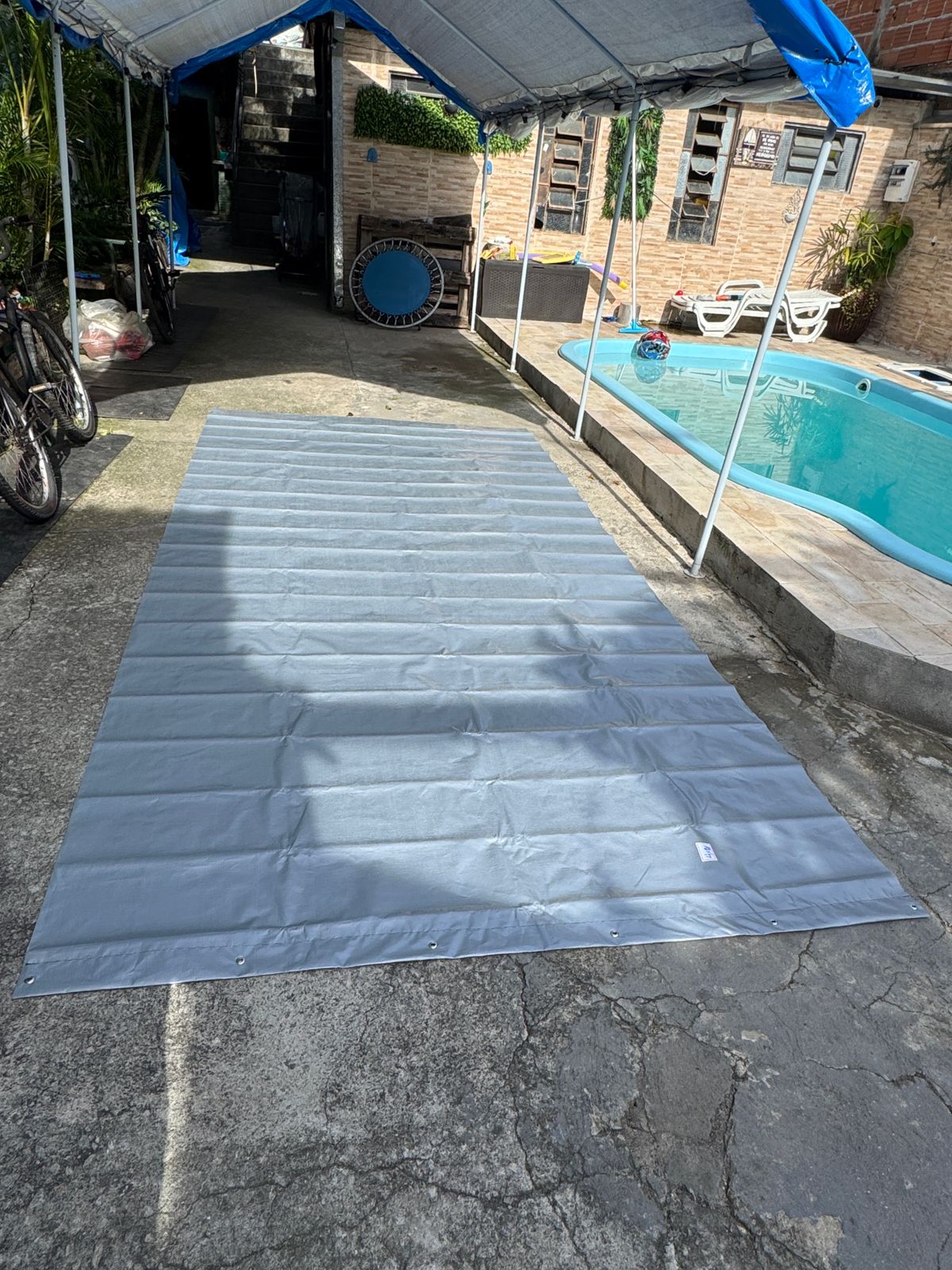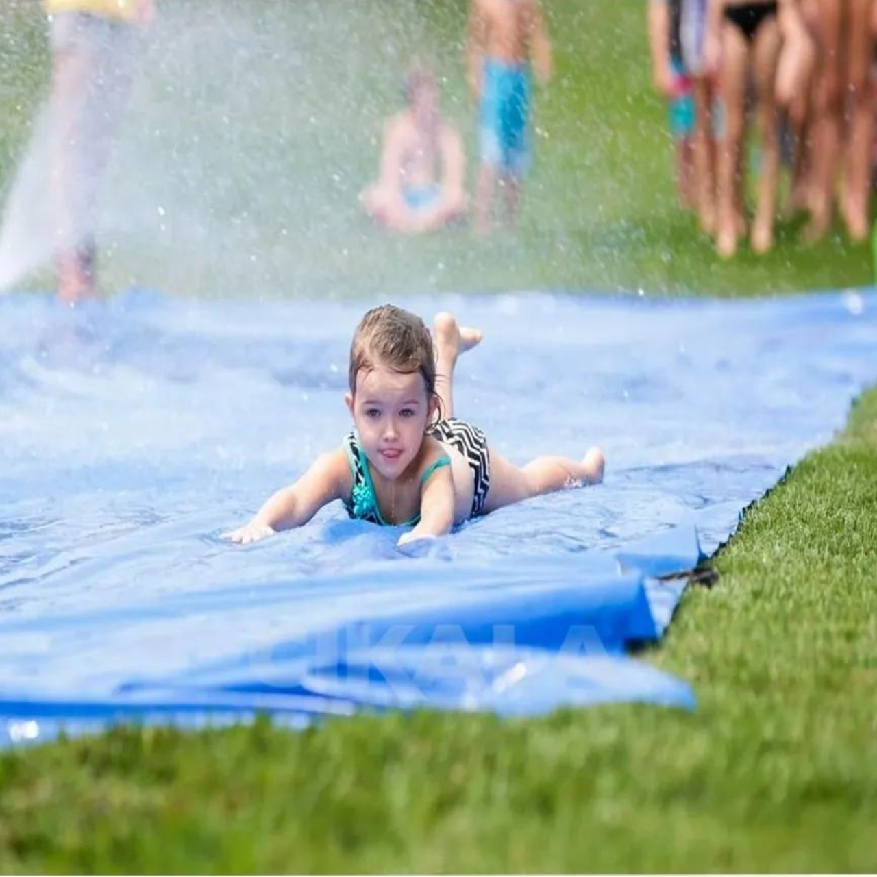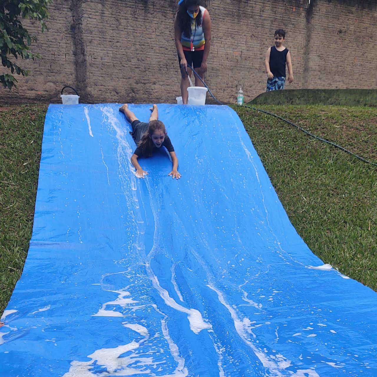 Basta posicionar a lona sobre o gramado, prender pelos ilhós e adicionar água (ou água com sabão) para criar uma super pista de escorregar cheia de diversão.